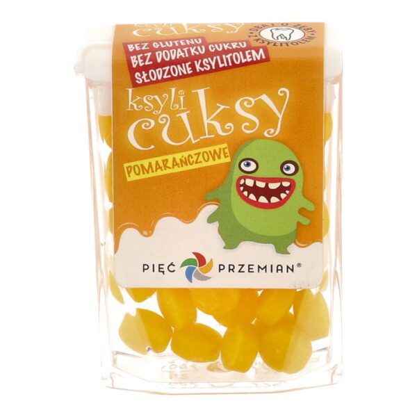 KsyliCuksy: pastylki do ssania z ksylitolu o smaku pomarańczowym.