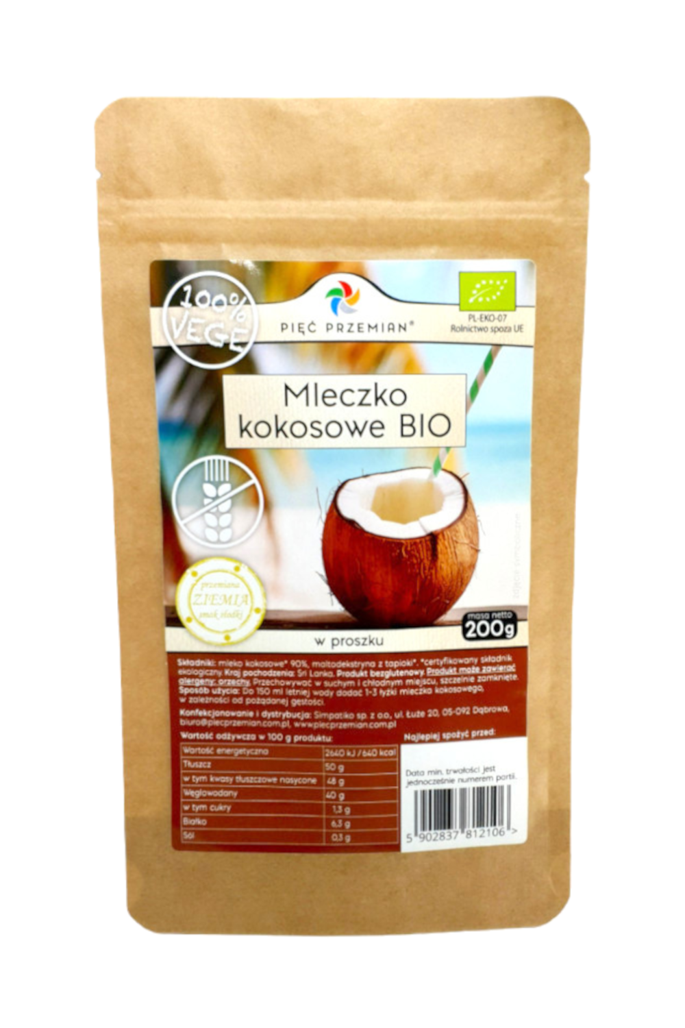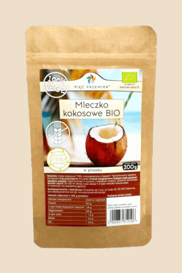 Napój kokosowy BIO w proszku bezglutenowy 200 g – Pięć Przemian
