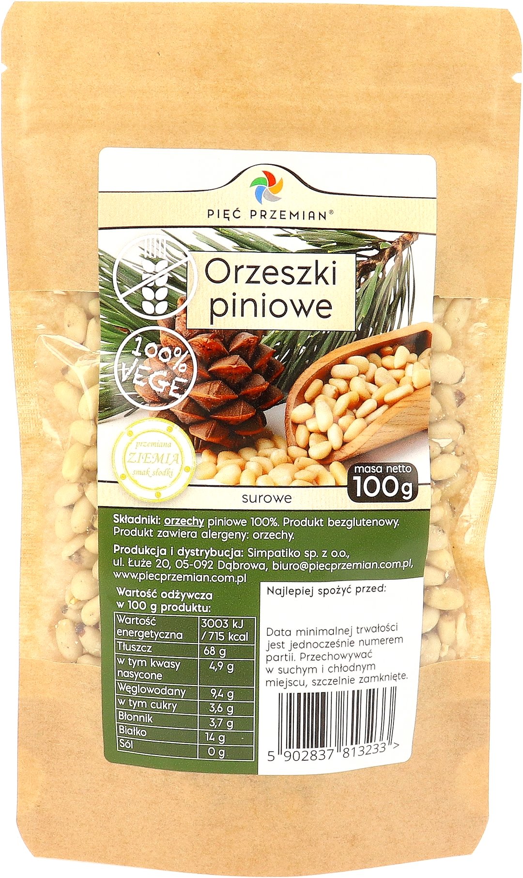 Składniki: orzechy piniowe 100%. Produkt bezglutenowy. Produkt zawiera alergeny: orzechy.