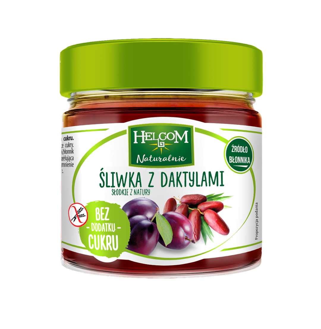 Składniki: śliwki 50%, daktyle suszone bez pestek 30%, woda, błonnik kukurydziany rozpuszczalny, sok cytrynowy, substancja żelująca:pektyny.